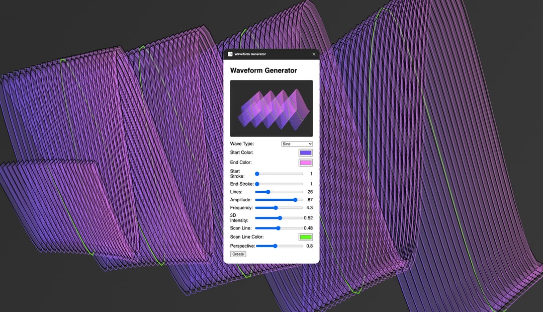 Used for experimental wireframes. It stacks vector waveforms in 3D space to visualize wavetable synthesis concepts quickly.